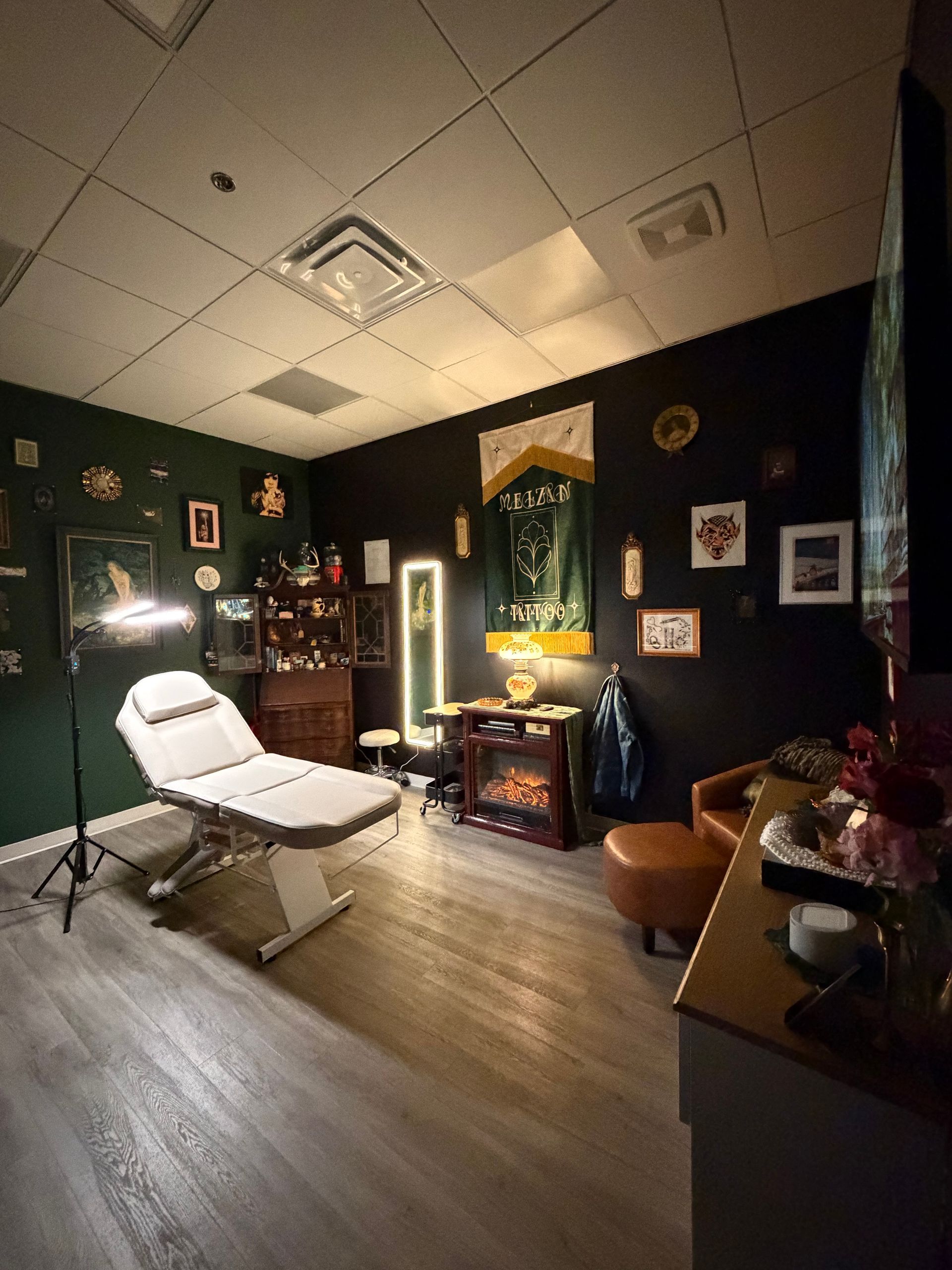 The studio offers a warm, intimate, and welcome atmosphere. The perfect environment to foster creativity and comfort for your next (or first) tattoo.